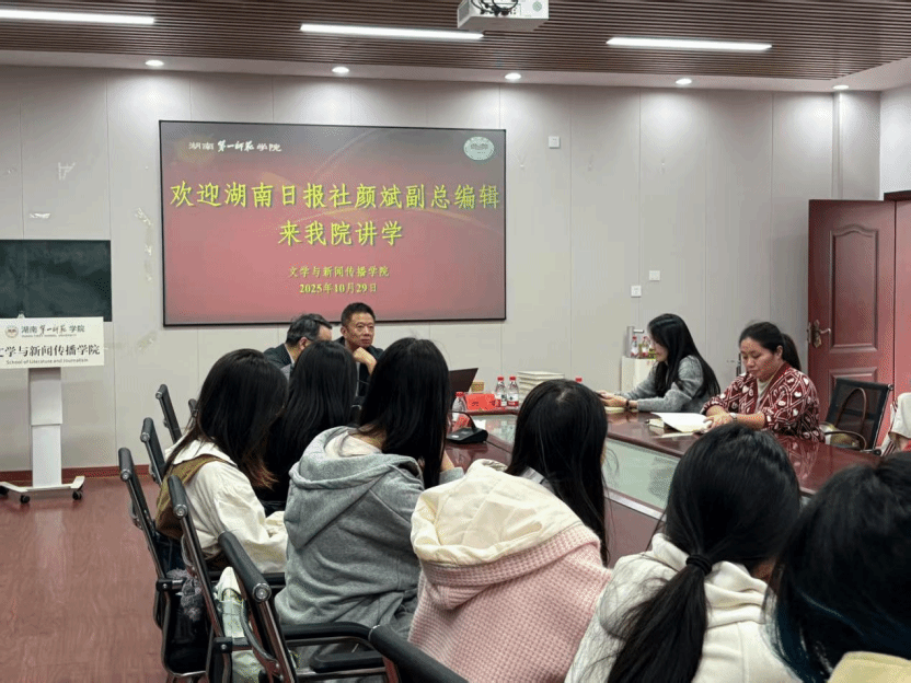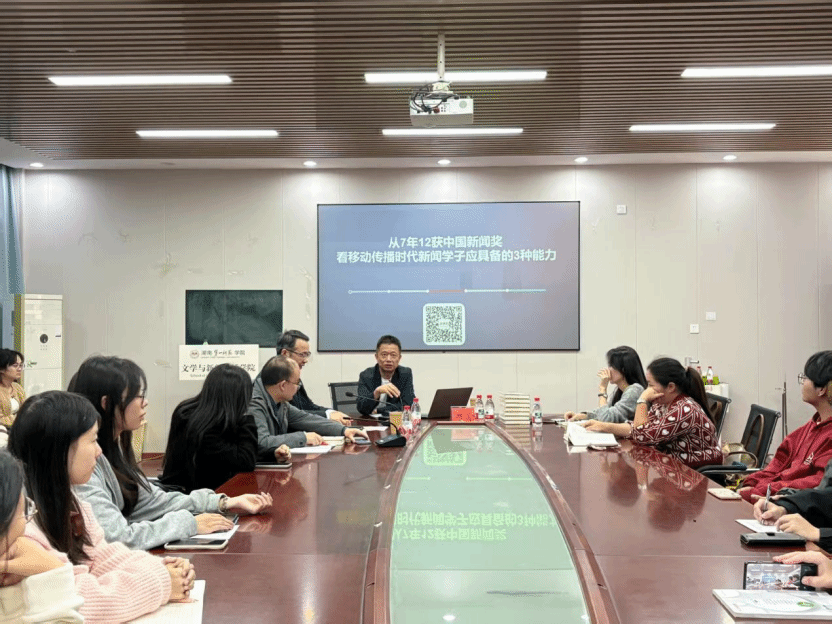 10月29日下午,湖南日报社党组成员、社务委员、副总编辑颜斌应邀为我们师生开展题为《从7年12获中国新闻奖看移动传播时代|新闻学子应具备的3种能力》的讲座。讲座由副校长彭晓辉主持,我们副院长杨水远、网络与新媒体系主任谢亚可、广播电视学系刘子瑜及网络与新媒体专业的学生参与本次讲座。