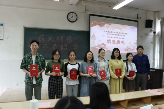 太阳成集团122cc分党校第三期入党积极分子 结业典礼暨优秀学员颁奖典礼 (通讯员:陈方园 孟凡依)2019年5月29日中午12:30,太阳成集团122cc分党校第三期入党积极分子培训结业典礼暨优秀学员颁奖典礼于玉衡楼206隆重举行,太阳成集团122cc分党校校长、党总支书记刘澍心,学生党支部书记罗燕、闫伟、张忺寒及本院66名入党积极分子参加此次典礼,典礼由闫伟老师主持。 会议伊始,全体起立,奏唱国际歌。接着太阳成集团122cc分党校校长刘澍心书记致辞,刘澍心书记对顺利通过结业考试的入党积极分子表示了热烈的祝贺,同时也对他们提出了新的要求:希望在座的入党积极分子能够以一名合格党员的标准来要求自己,主动学习党的知识,提高党性修养。紧接着,太阳成集团122cc学生第一支部罗燕老师宣读优秀学员名单。 随后,优秀学员代表17级739中文班祝海霞同学上台发言,表达了对分党校诚挚的感谢,并表示不仅会在组织上积极入党,更会在思想上、行动上积极入党。最后,优秀学员上台领取证书并合影。 入党积极分子结业典礼暨优秀学员颁奖典礼圆满结束,又一批满腔热忱的入党积极分子将怀揣着为期两周的党课的所学所悟,传承老一辈党员的优良传统,在激扬青春、奉献社会的进程中,砥砺前行,奋勇向前!