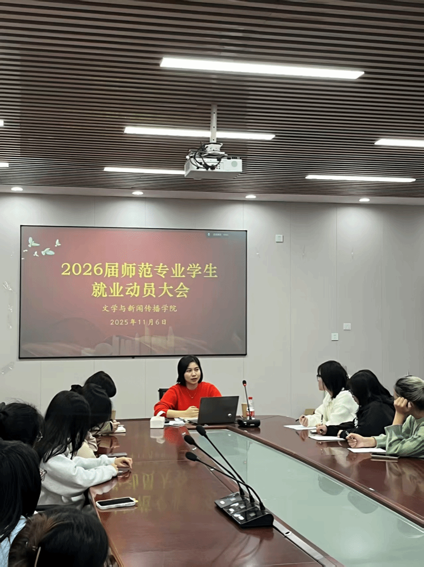 11月6日晚,我们2026届师范专业学生就业动员大会在玉衡楼201会议室以“线下主会场+线上直播”相结合的形式顺利召开。学工办主任王娜、毕业班辅导员李倩及全体2026届师范专业毕业生参与会议。