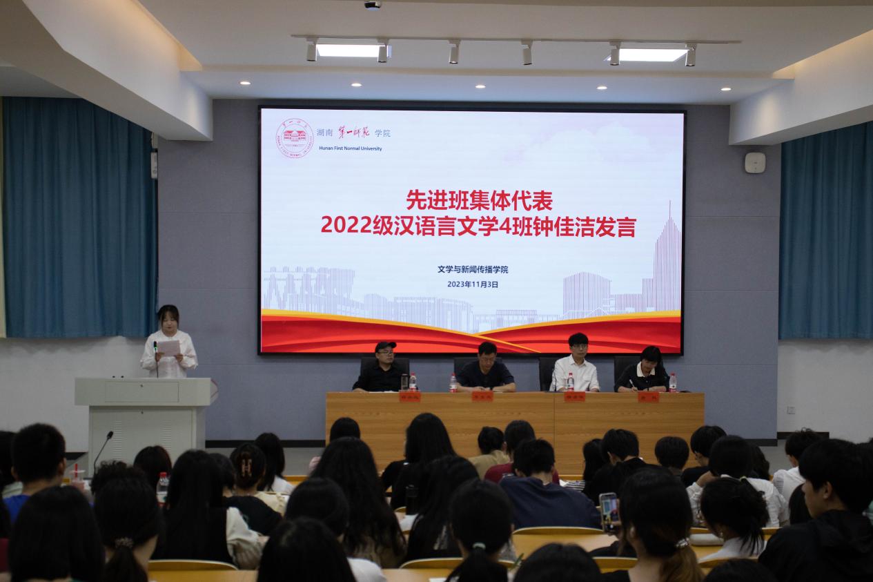 2022级汉语言文学4班钟佳洁作为先进班集体代表发言,她建议班级主要学生干部以班风建设为抓手,发挥模范带头作用,以良好班风推进求真务实的学风建设。学生代表2021级网络与新媒体1班何小雨分享了自己的学习经验,号召广大同学树立正确的学习风气,培养竞先争优的精神,争取为学院发展贡献力量!