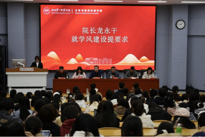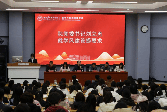 大会议程第二项,学院党委副书记李豪杰作学风建设报告。报告全面回顾了学院通过协同联动、制度保障等举措取得的显著成效,李豪杰指出,在2024-2025学年,我们始终将学风建设作为人才培养的战略工程,从“精细管理强内涵、阅读推广增效能、品牌深耕促转化”等维度打造了“全员协同、多维赋能、全程贯通”的学风建设体系。一年来,学院着重探索日常管理“内涵提升”的转变机制,推进优良学风进公寓,将学生生活阵地打造为立德树人的重要平台,量化学风建设考评指标,多次研究和修改《学生综合素质测评方案》和《先进班集体评选细则》,发挥杠杆作用,形成长效机制;深度融合学风建设与阅读推广活动,从班级阅读氛围、活动形式创新性、阅读成果展示质量等维度开展书香班级评选工作,用浓浓书香为学风建设注入新动能;深耕学院“语言文化艺术节”“影视文化艺术节”“三五七工程”等品牌文化活动,实现学生课堂学习成果的高质量转化。2024-2025学年,学院2025届毕业生考研考公考编上岸率再创新高,上岸总人数达到94人,占毕业生总数的27.89%,录用单位涵盖国家税务总局、市公安局、市人民法院、地方选调生等多个系统和部门,更涌现出湖南省高校“年度影响力大学生”肖睿一等一批优秀学子代表。